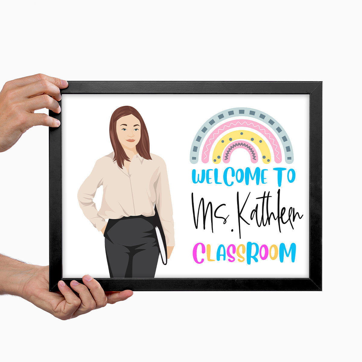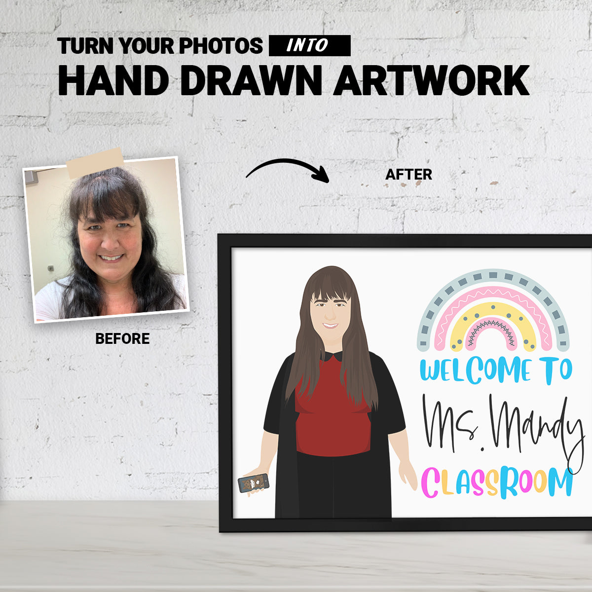 Introducing our newest product - the Welcome to Classroom Picture Frame Personalized! It's the perfect way to personalize your classroom as a teacher. We take your photos and turn them into custom hand-drawn illustrations, printed and put in a frame personalized with your teacher's name. This makes a great gift for any teacher!